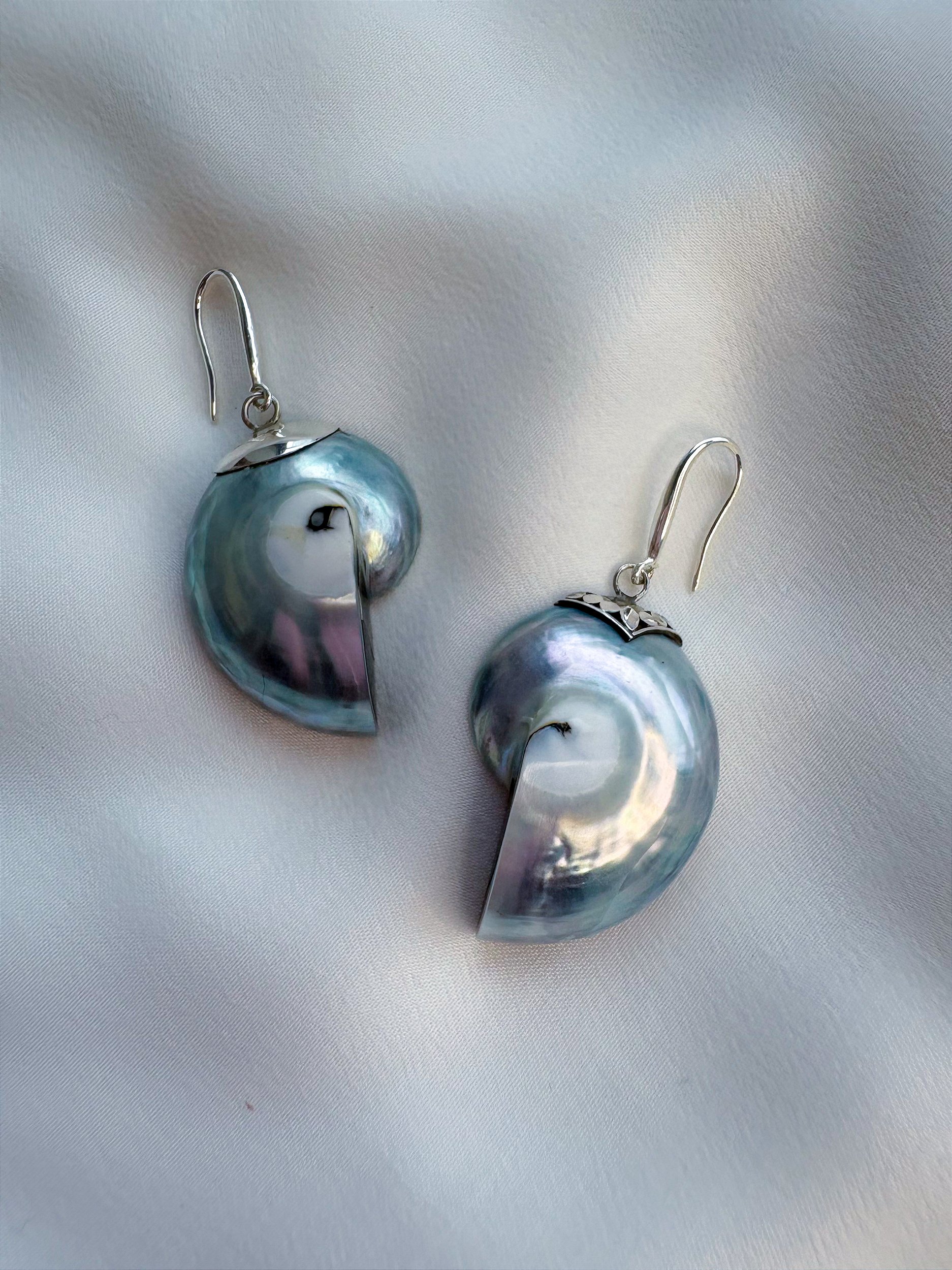 Onde a beleza interior das conchas Nautilus é encapsulada em resina derramada à mão e elegantemente emoldurada com prata reciclada. Estes brincos redefinem o chique praiano, oferecendo um equilíbrio perfeito entre charme inspirado na natureza e sofisticação moderna.